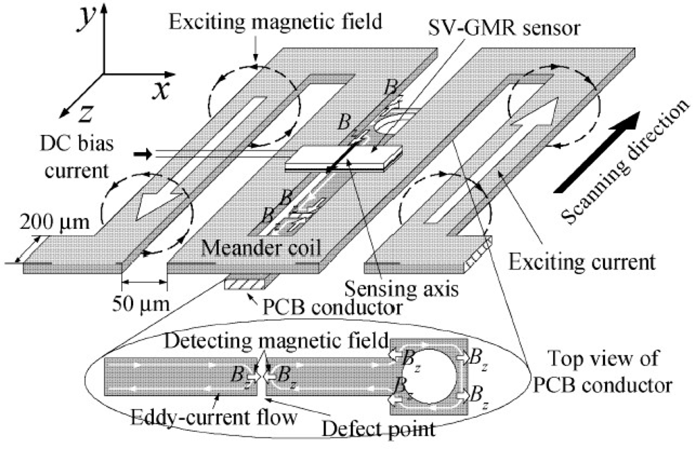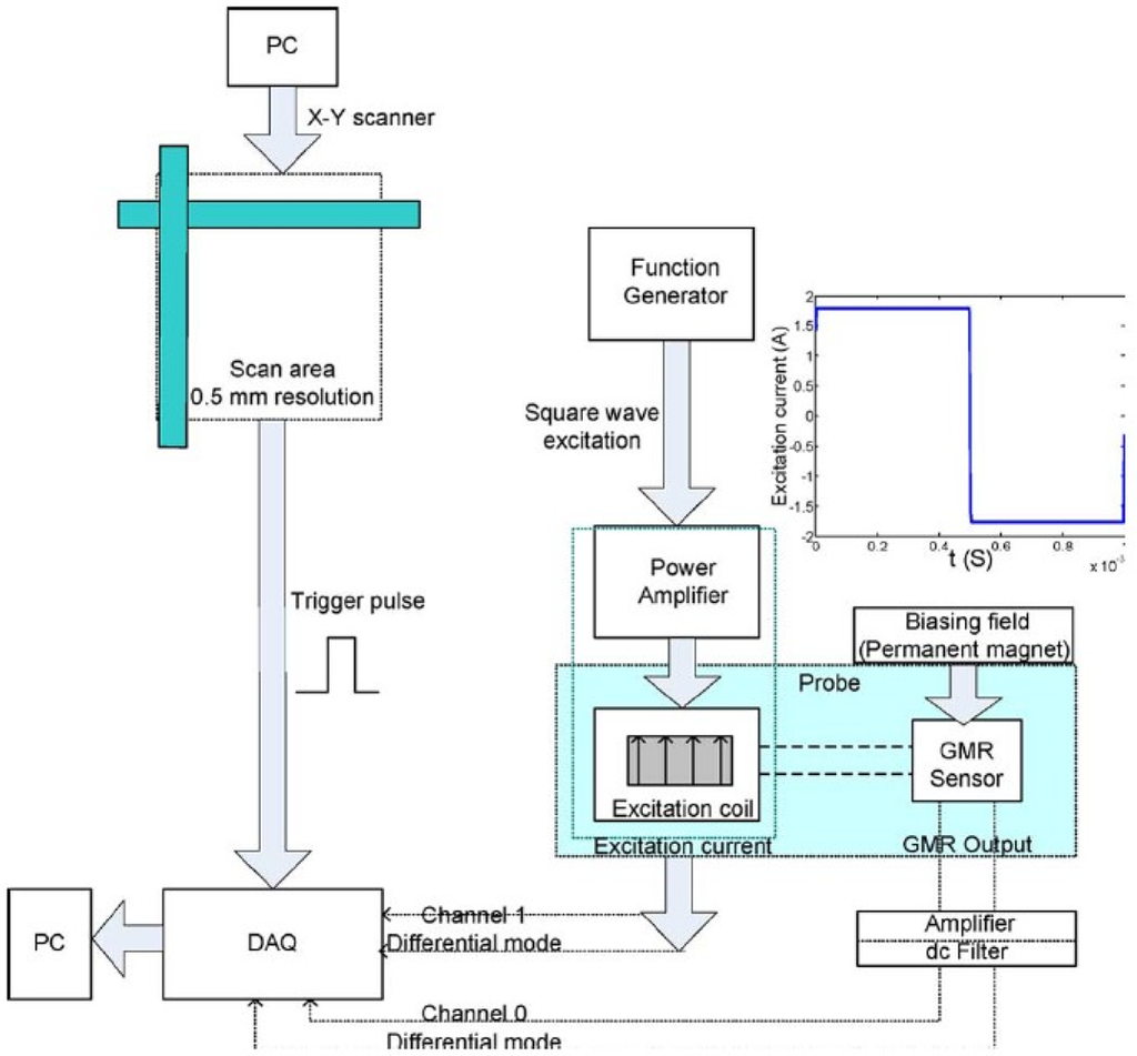 In the year of 2006, Yamada et al. proposed a needle type GMR imaging technique, SV–GMR system and the applications of this new sensor including the inspection of bare printed circuit board and the measurement of the density of magnetic fluid injected in living body for the hyperthermia treatment [64]. The SV–GMR imaging system schematic is shown in Figure 27. Singh and Raj et al. developed another novel imaging system involved both GMR sensors and MFL principles for detection of various near side notches and far side notches in a 12 mm thick carbon steel [65]. At NDE lab of Michigan State University, a flexible and efficient real-time GMR imaging system for nondestructive evaluation of aircraft was developed by Nair et al. with several advantages over the past prototypes [66]. The reader can find other similar types of EC-GMR system that were developed within the last decades, for example the system by Postolache et al. published in 2008 [67] or Tsukada system in 2006 [68], etc.