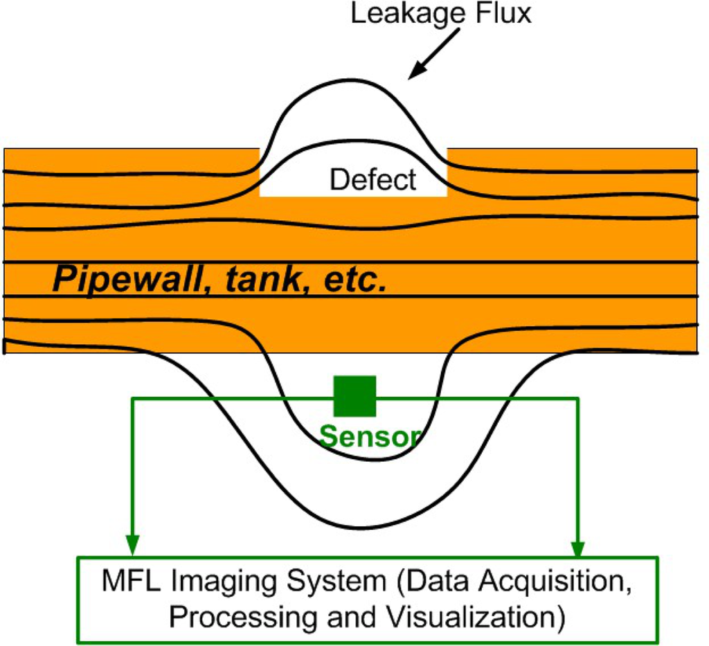 Magnetic flux leakage(MFL) method is one important and widely used techniques in static eletromagnetic imaging methods. It is used for nondestructive evaluation of ferromagnetic objects and generates grey scale images that are representative of the integrity of those objects. Defective areas typically appear as bright regions in the image. The schematic of an MFL imaging system can be found in Figure 2. It clearly shows effects of induction on magnetic lines at discontinuity: surface leakage flux occurs at high magnetization level and with defects present, then gets picked up by the MFL sensors before passing to the imaging system for processing.