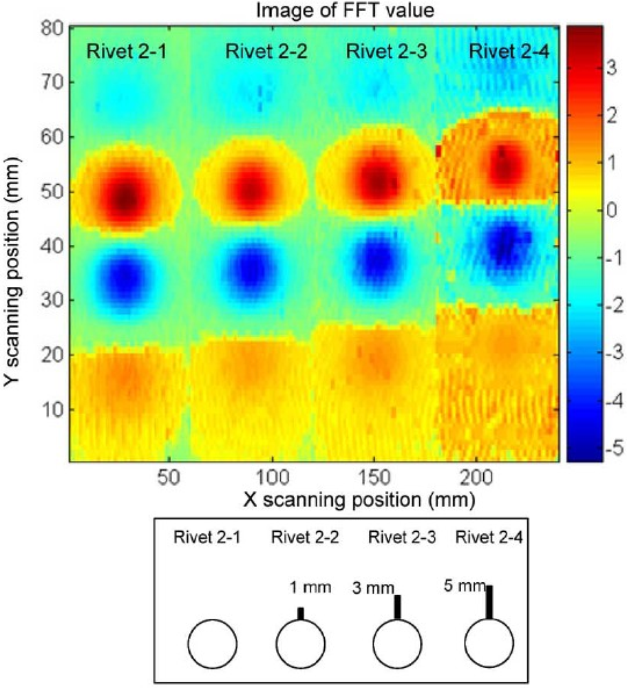 Due to the low operating frequency and subsequent noisy signals, the EC–GMR image processing and analysis is always critical and challenging. Numerous efforts have been put into this problem, and in 2009, Deng et al. introduced the optimum detection angle (ODA) to combine the in-phase and quadrature components of GMR signals, enhanced the GMR image data by over ten orders of magnitude in SNR [69]. Kim et al. developed a PEC–GMR imaging platform in 2010 and proposed a principle component analysis (PCA) based feature extraction and classification algorithm for those data [70], which took advantage of both pulsed excitation and sensitive GMR sensors. Most recently, Zeng et al. published several quantitative metrics for characterizing EC–GMR images and the improvement in probability of detection(POD) was clearly demonstrated [71].
