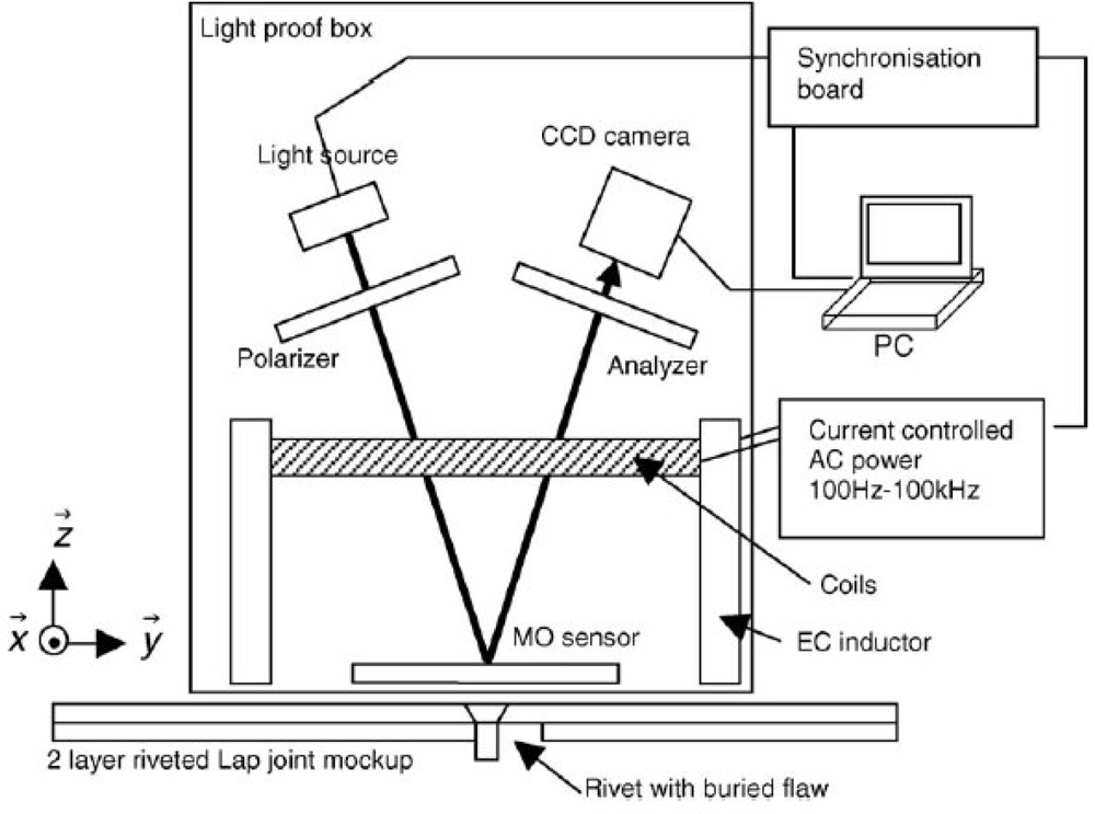 In order to achieve faster imaging speed with higher image resolution, several EC-based hybrid imaging techniques were developed. One of the most successful methods among them is the magneto-optic (MO) imaging technique invented by Shih and Fitzpatrick in the early 1990s [54]. The magneto-optic imager (MOI) is widely used in detecting surface and subsurface cracks and corrosion in aircraft skins. The instrument provides analog images of the anomalies based on eddy current induction techniques and an MO sensor using the Faraday rotation effect. The schematic of the EC–MOI system is shown in Figure 23.