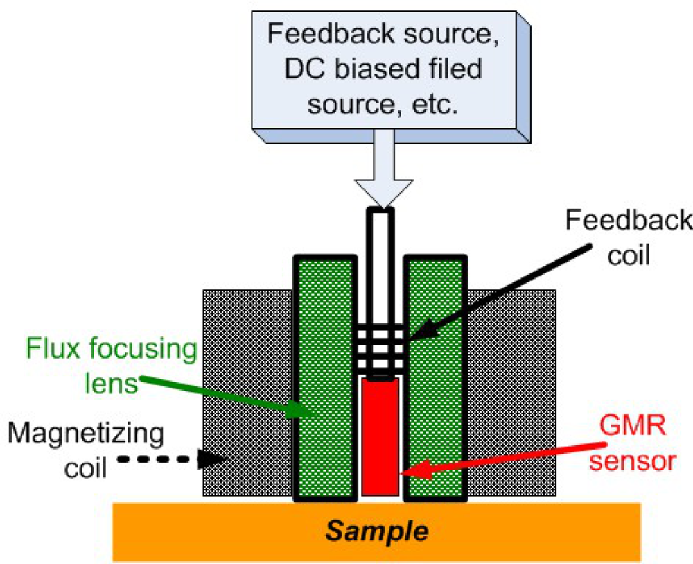 For EC imaging, there is always a trade-off between the penetration depth due to skin depth effect and better image resolution that is directly related to frequency. In particular, the low frequency sensitivity of the GMR provides a practical means to perform electromagnetic inspections on thick layered conducting structures. Wincheski et al. at NASA Langley Research Center incorporated a commercially available GMR sensor into the self-nulling probe and their research showed that this imaging set up can greatly enhance the low frequency capabilities of the imaging device. By combining with image processing, their system has resulted in a greatly improved signal-to-noise ratio (SNR) for very deeply buried flaws in conducting materials [63]. Figure 26 shows an illustration of their system schematic.