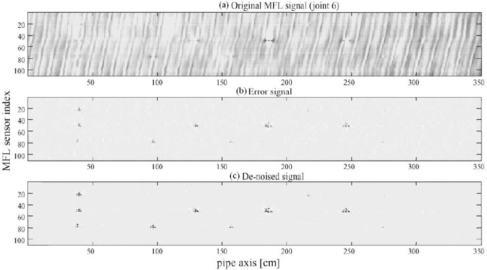In 2002, Afzal and Udpa introduced a new technique that employs wavelet based de-noising and adaptive filtering for detecting signals in MFL images, which were obtained from seamless pipes [8]. The proposed algorithm is computationally efficient and data independent. Field test imaging results before and after the seamless pipe noise (SPN) removal are shown in Figure 3. The stripe pattern can easily bury the useful information and significant improvement has been demonstrated according to the original MFL image and de-noised images comparison.