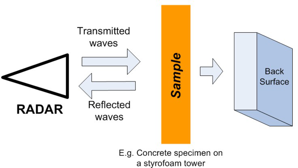 Critical infrastructure monitoring and inspection is always a challenging problem. Radar imaging has become a powerful and effective tool for the nondestructive testing of concrete structures. Weedon et al. proposed a step-frequency radar imaging system in 1994 [76]. An advancement of the method can be achieved through the understanding of the interaction between electromagnetic waves and concrete, and the identification of optimum radar measurement parameters for probing concrete [83]. Figure 30 is a simple radar imaging experimental system setup. Rhim et al. developed a wide band imaging radar to obtain 2D and 3D imagery of concrete targets.Three different types of internal configurations were imaged. For the determination of optimum parameters after systematic radar measurements, they found that 2 to 3.4 GHz waveforms are adequate for the concrete thickness measurement, 3.4 to 5.8 GHz waveforms are adequate for the detection of delamination, and 8 to 12 GHz waveforms are adequate for the detection of inclusions embedded inside concrete [83]. Rhim, in the year of 1998, also published the concrete materials characterization results using electromagnetic frequencies from 0.1 to 20 GHz that will serve as a basis in applying wide band microwave imaging techniques for NDE of concrete using radar [84].