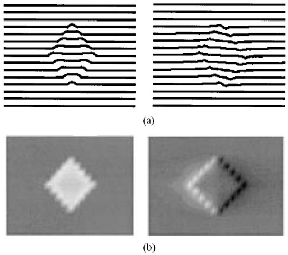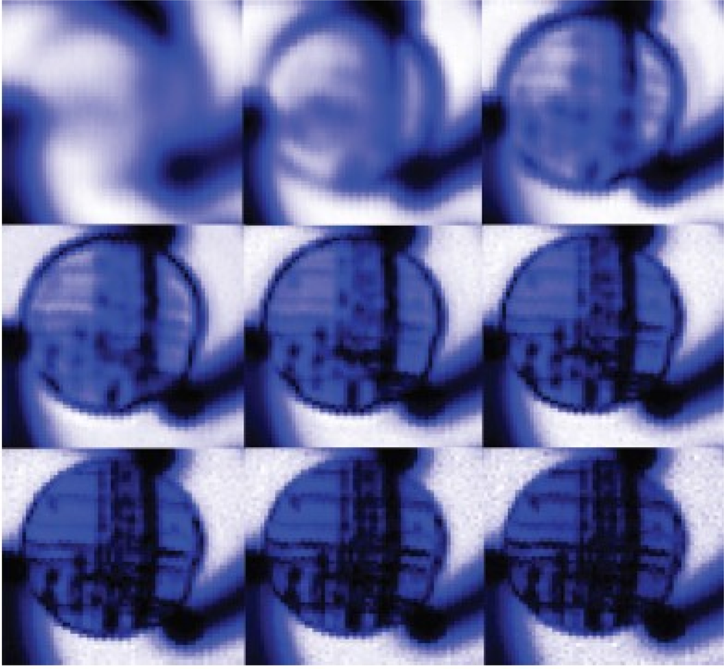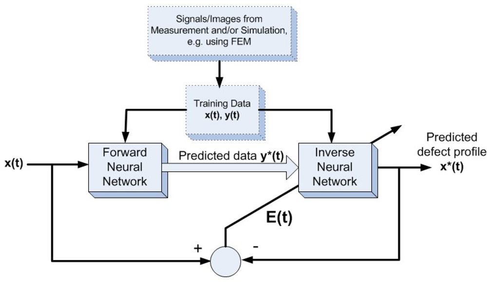 For image inversion techniques, the same group published two articles on MFL image reconstruction based on neural networks in 2002 and 2003 by Ramuhalli and Udpa [9,10]. In their papers, the radial basis function and wavelet basis function were first trained to approximate the mapping from the measured signal to the defect space, and the trained networks were used iteratively to estimate the defect profile. They extended their approach to the innovative multi-networks that are in feedback configuration and composed of a forward network and an inverse network. The schematic of the multi-networks are shown in Figure 4 with typical inversion results presented in [10]. Three-dimensional defect reconstruction for MFL imaging were further developed in 2006 by Joshi and Udpa based on the RBFNN approach with the coarse to fine results shown in Figure 5 [11].
