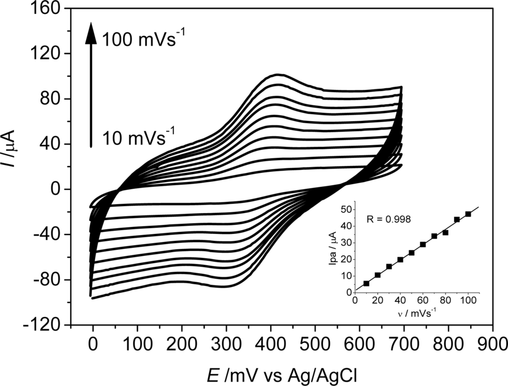 Voltammetric studies at different scan rates resulted in a linear relation between the anodic peak current values and the scan rate (Figure 3), which is a characteristic behavior for confined species in the bulk of the electrode, indicating that the electroactive species are strongly entrapped in the electrode surface [32].