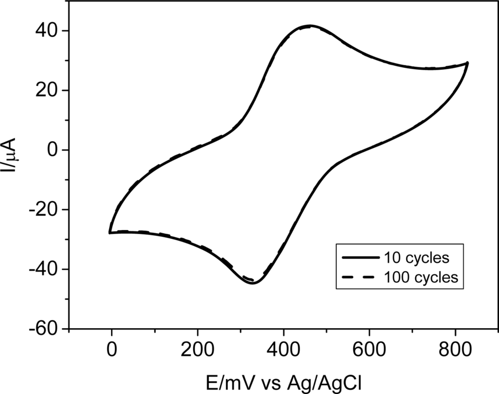 In order to verify the stability of the modified electrode, consecutive voltammograms were obtained in the presence only of the electrolyte solution at a fixed scan rate (ν = 50 mV s−1). The voltammetric profile was analyzed as a function of the anodic current peak values (Figure 4). After repeated cycles (approximately 100), the current response of the bulk-modified carbon ceramic electrode did not decrease substantially (with a 0.22% variation, shown in Figure 4), indicating that the modified CCE is quite stable and can be used as an electrochemical sensor. The reproducibility of the electrode response was also studied as a function of the days (in the electrolyte solution) for one month. In this case, the Ipa variation was of 1.42 % and for Epa 0.18%, showing that the electrode holds its efficiency within this period of time.
