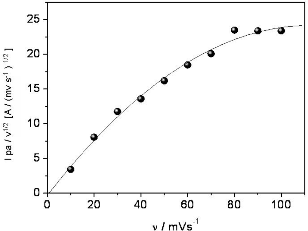 The electrocatalytic response was confirmed by performing a blank test, in the absence of the ferrocenecarboxylic acid, i.e., using CCE (instead of modified CCE) as electrode material. In this case, the increase in the anodic peak was considerably lower, even in the presence of 10 × 10−3 mol L−1 of DA and slightly dislocated to higher positive potential (Epa = 448 V). The plot of peak current against the square root of the scan rate in the range of 10–100 mV s−1 showed a linear relation (with r = 0.996), indicating a diffusion controlled process, what is expected for catalytic systems and it is advantageous for quantitative measurements. Moreover, in order to confirm that DA oxidation occurred by an electrocatalytical process when the CCE/Fc was employed, the dependence of the parameter Ipa/ν1/2 on scan rate was plotted, as shown in Figure 5. According to Nicholson and Shain [34] a non-linear relationship of the plot Ipa/ν1/2 vs. ν exhibit the characteristic shape of a typical EC (electrochemical-chemical) catalytic process, as observed for the CCE modified with ferrocenecarboxylic acid. These results are similar to those obtained for other electrocatalytical systems for DA oxidation [27].