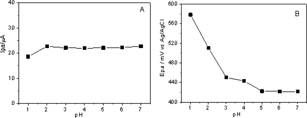 The pH chosen for further measurements was 7.0, since that in this condition Epa is not dislocated much to higher positive potentials and it is close to the physiological pH, what favors the application of the modified electrode in living systems.