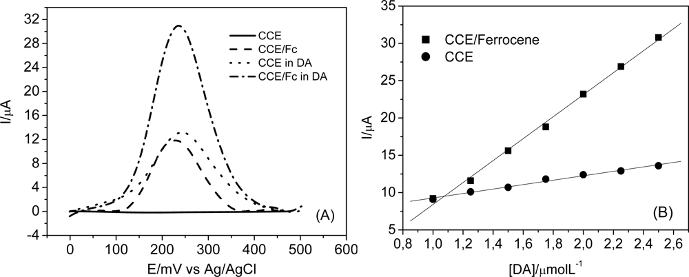 When compared to the non-modified CCE, the CCE/Fc has showed a lower detection limit and higher sensitivity for DA determination, as can be seen in Figure 8. This behavior can probably be related to the affinity between the electrocatalyst (ferrocenecarboxylic acid) and the analyte (DA), which consequently enhances the efficiency of the electron transfer processes. Ferrocene derived compounds have been used as electron mediators in modification of carbon paste electrodes [39], glassy carbon [40] and also in the preparation of films on gold surfaces for determination of DA [41].