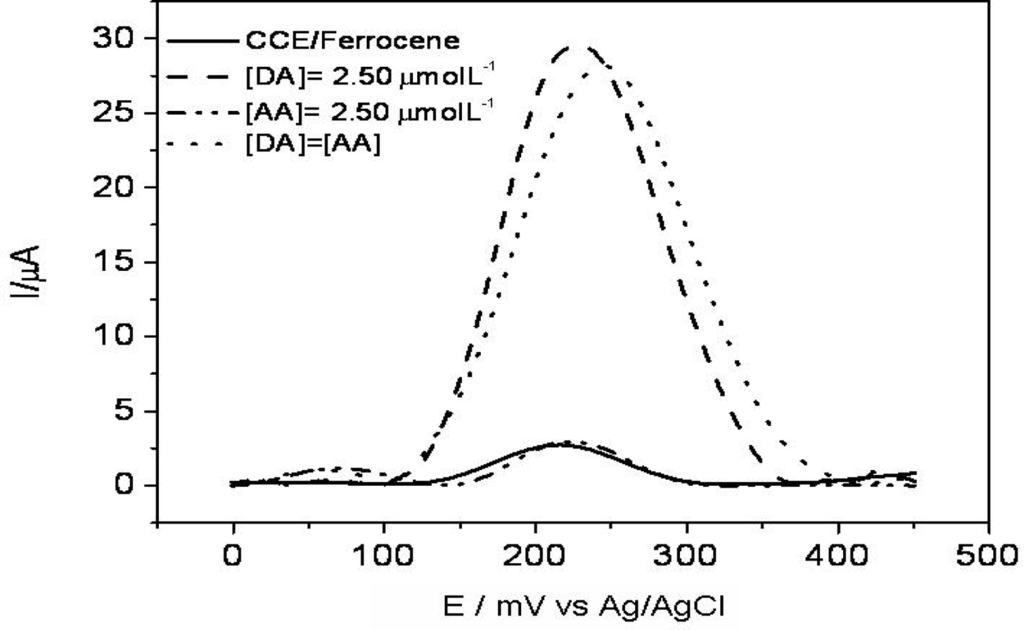 The influence of ascorbic acid (AA) in the electrochemical oxidation of DA was evaluated using the SWV technique. According to Figure 9, using this technique the CCE/Fc presented only one peak which appeared at 230 mV. After DA addition, a considerable current peak increase is observed at the same potential. In contrast, in the presence of AA, a peak appeared at 50 mV, probably due to the AA oxidation at the CCE/Fc. Therefore, different from described in the literature, the current peak did not increase with AA concentration until 1.0 mmol L−1 [42]. This behavior can be explained considering that as the pKa of ferrocenecarboxylic is 4.2, in the electrolyte solution at pH 7.0, the anionic form of AA is predominant and it is responsible for the electrochemical response. At these conditions the CCE/Fc probably repels the AA species, hindering their approximation to the electrode surface, and causing a decrease of the electrode sensitivity for these species compared to the DA molecules (which is in the cationic form at pH 7.0).