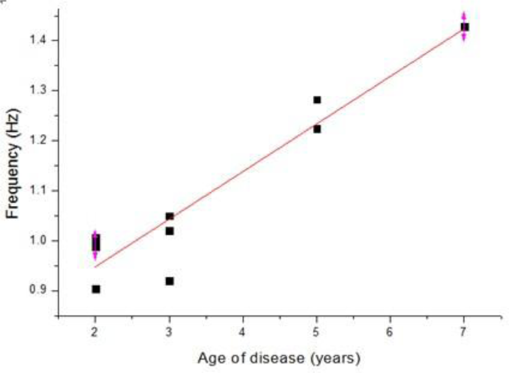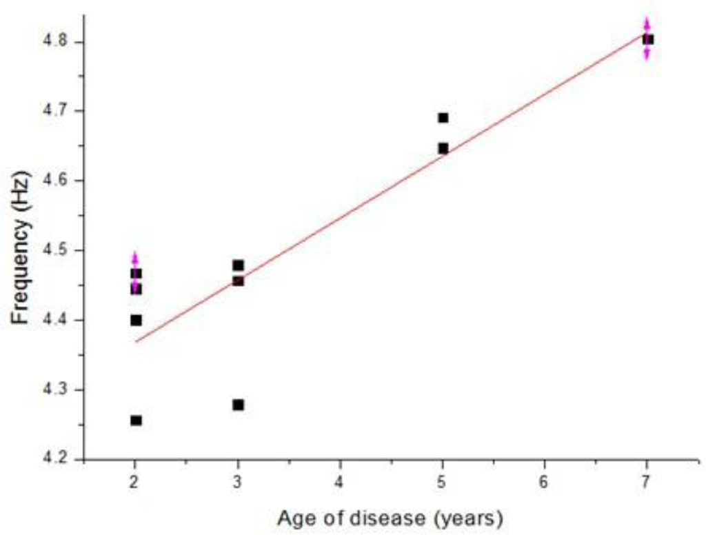 The measurement results for the dorsum manus resting tremor frequency obtained from the different volunteers for normal and Parkinson’s disease patients are shown in Tables 5 and 6, respectively. Table 5 shows the results for the control group. The normal human dorsum manus frequency ranges from 0.31 to 0.48 Hz, with an average frequency of 0.41 Hz. Table 6 shows the results for people suffering from Parkinson’s disease. The frequency ranges from 4.25 to 4.8 (Hz), with an average frequency of 4.5 Hz. The average frequency difference is Δf posture = Δfpatient − Δf normal = 4.09. From the results in these two tables we can see that the vibration frequency is significantly higher in the Parkinson’s disease patients than in people without the disease. The experimental results are consistent with the references, where in humans, Parkinson resting tremor generally occurs in the 3–7 Hz frequency range. The P-value of correlation between the age of disease and the vibration frequency is 0.009633 shown the graph in Figure 14 [14].