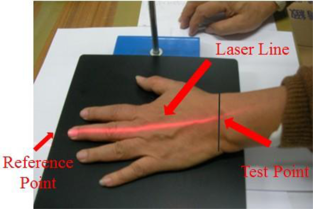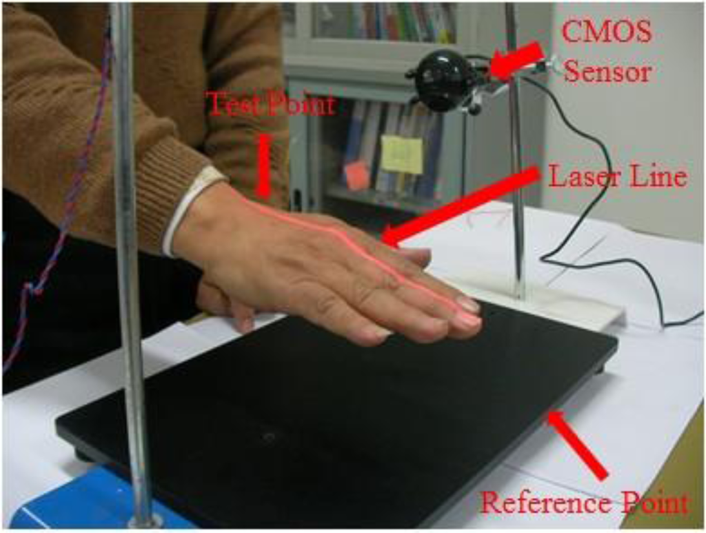 In the next set of experiments, we carried out the detection of rest state (hand is resting on the testing table) frequency vibration. The set-up is shown in Figure 12. In this setup the laser line from the laser diode through a cylindrical lens is projected on the measurement site of the dorsum manus. The image of the laser line on the skin is capture by the CMOS image sensor. The vibration frequency of the two chosen points: one reference point is ahead of the middle finger tip on the table and one test point which is the intersection of the medius line and the last striae transverse of the back of the left hand. Thess test points directly under the laser optical axis are processed by FFT (fast Fourier transform). The vibration frequency of the test point and the reference point measurement system is shown if Figure 12 and the test point position on the back of the left hand is shown in Figure 13.