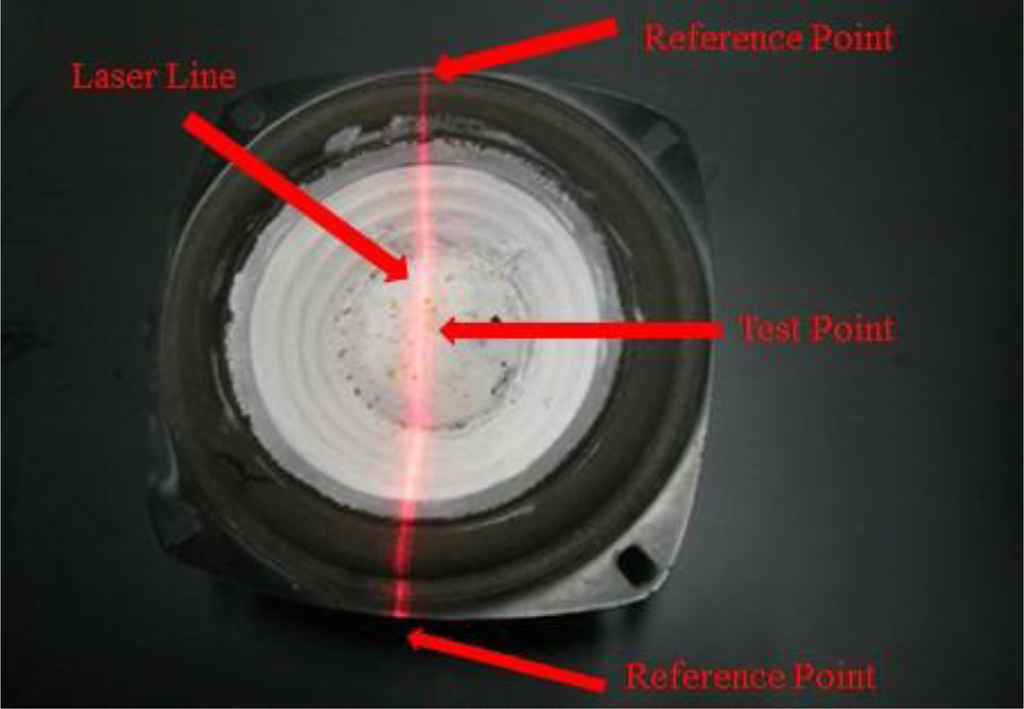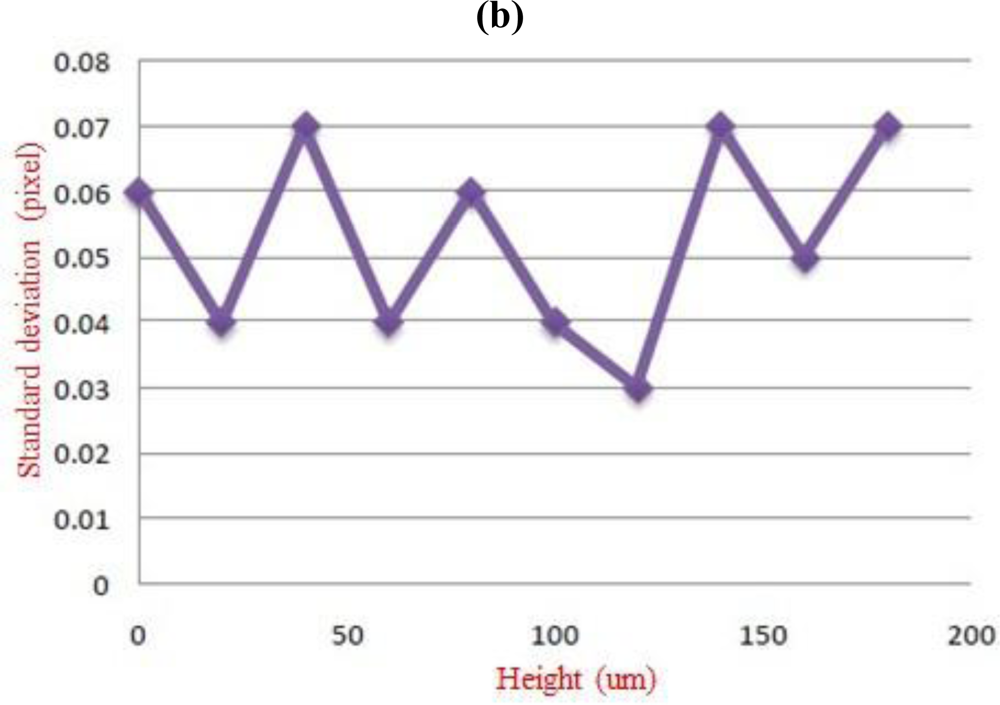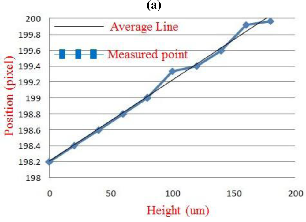 There are two calibrations in our system: (1) The amplitude measurement calibration, (2) the frequency calibration measurement. In these calibrations, we change the test subject of Figure 1(a) to a standard subject: the precise position translator for amplitude measurement and the precise frequency vibration drum for frequency calibration. The amplitude measurement calibration of the Parkinson’s disease measure system was by a precise translator. A precise translator was used as a support platform to calibrate the linearity of the Parkinson’s disease measure system [13] and is shown in Figure 4. In this experiment, the system measured on the platform the amount of change in z-axis displacement as a correction. The laser line will be drifting up and down. We recorded the centroid position of the laser line by the average distance within 3 seconds. This was done a total of 10 times and each time moved to 0.1 ± 0.01 mm, so the total distance moved is 1 mm in the z-axis direction. The results of the linearity calibration experiments are shown in Figure 5(a). We made the measurements 30 times and get one standard deviation. The results are shown in Figure 5(b). On the other hand, for frequency calibration, we use our laser line to project on a loudspeaker as a test subject which was driven by a function generator (LFC-1300, leaden, Inc), with some specified frequencies. These specified frequencies could be referred as a standard frequency of the drumhead variation, so as to be compared with the laser line variation on it. The layout of the frequency calibration for Parkinson’s disease vibration measurement system is shown in Figure 6. The actual loudspeaker which the projected laser line on it is shown in Figure 7. Here the laser line was projected across the center of the drum center which is the test point, and at the end of the laser line which is on the stable support ring of the variations drum head as the reference points. The reference point is on the rigid unmovable edge part of the drum. When the drumhead vibrated, the variations of the laser line were captured by the CMOS image sensor of the Parkinson’s disease measurement system. The test point vibrations were recorded and transformed to vibration frequency through FFT. The results compared with the function generator’s driven frequencies from 0.5 to 10.0 Hz, are shown in Table 1. In the test, the frame capture rate of the CMOS image sensor of the Parkinson’s disease measurement system was set to 15 frames/sec and the pictures captured by the CMOS image sensor lasted for 10 or 20 seconds for each measurement [13].