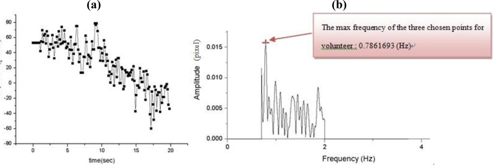 In Figure 9(a) shows the results of the first experiment for time vs. amplitude of the postural action tremor for the control group for dorsum manus vibration as measured by this system. The original data for centroid variation of the laser line with time and the floating state vibration frequency distribution after FFT (maintaining hand posture) are shown in Figure 9(b). Figures 10(a,b) show the same results but for the Parkinson’s disease patient’s dorsum manus.