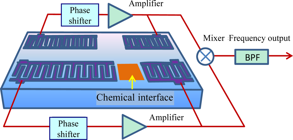 Due to the threat of terrorism and environmental pollution there is great demand for chemical sensors with high sensitivity and good stability towards organophosphorous compounds for real-time monitoring. Among currently available chemical sensors, surface acoustic wave (SAW) devices are favored and are very promising for chemical sensing applications due to their small size, low cost, high sensitivity, and reliability. Figure 1 shows the schematic and working principle of a typical SAW chemical sensor, composed of a dual-delay-line oscillator and a chemical interface coated onto the acoustic path of a SAW device. SAW chemical sensors present variations of the SAW phase velocity and attenuation as the vapor adsorbed on the chemical interface. The chemical interface is a chemical compound over the SAW propagating path, that selectively and reversibly interacts with the specific analyte vapor. The shift in phase velocity, and attenuation is measured by recording the frequency and insertion loss of the SAW device, respectively. Various effects, including mass loading, viscoelastic effect loading, and acousto-electric coupling [1–4], contribute to the SAW vapor response.