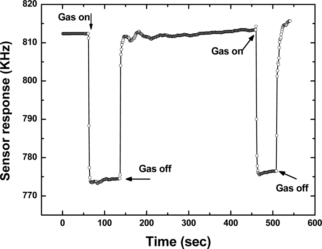 Then, the repeatability of the fabricated SXFA-coated SAW sensor was investigated. Figure 10 showed a typical response profile obtained from two consecutive 100 seconds on-off exposures to 1,000 mg/m3 of DMMP at 24 °C, 68% RH and gas flow speed of 1 L/min. Here, the frequency response was recorded every 1 second so that one point on the graph corresponds to a 1-second interval. The sensor response showed a rapid rise upon exposure to DMMP and reaches the equilibrium (saturation) value in approximately 10 seconds. When the gas was removed by N2, the sensor response returned to its initial baseline value within 10 seconds. The transition of initial state-adsorption-stable equilibration state-desorption-recovery to initial state was clearly observed. From this promising result, we consider that this sensor has excellent repeatability in response to DMMP.