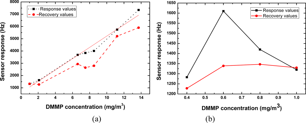 We exposed the SXFA-coated sensor to various DMMP concentrations to evaluate its sensitivity. Figure 11 shows the obtained frequency shifts at various DMMP concentrations under fixed 23% RH and 14 °C conditions. At high DMMP concentrations (>2.0 mg/m3), the sensor response increased linearly with increasing DMMP concentration, which satisfies the law of the adsorption isotherm in solids [Figure 11(a)]. Excellent reproducibility was also observed from the comparison between the response and recovery values. The sensitivity in the DMMP concentration range of 2∼14 mg/m3 was evaluated as ∼485 Hz/mg/m3. In contrast, at low DMMP concentrations (<1.0 mg/m3), the sensor response was complicated, as shown in Figure 11(b). In the initial part of the testing period, the sensor response increases with increasing concentration, however, the opposite phenomenon occurs upon further testing. A peak of the sensor response was observed at the DMMP concentration of 0.6 mg/m3, which is coincident with the adsorption isotherm in liquids. On the basis of the measured results, we suggest that at the tested temperature, viscous-liquid SXFA presents the adsorption properties of both solid and liquid forms. Also, from Figure 11(b), a larger sensor response (∼1,280 Hz) occurs at a DMMP concentration of 0.4 mg/m3. It means very lower threshold detection limit will be achieved using the present oscillator with superior frequency stability. In our sensor, based on the International Union of Pure and Applied Chemistry (IUPAC), it means the lower detection limit of 0.004 mg/m3 (0.7 ppb) is possible owing to the excellent short-term frequency stability of the oscillator (frequency shift of ±2 Hz in seconds), which provides a signal-to-noise ratio of more than 100:1. The measured data is better than the reported values from similar sensor structures [18]. The measured results indicate that the presented SXFA-coated chemical sensor was very promising for organophosphorous compound detection at extremely low concentration.