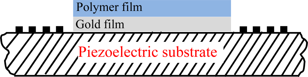 As well known, polymer materials are the primary chemical interface for vapor detection. Polymers have a higher sensitivity, lower detectable limits, and better ability to operate at room temperature than metal-oxide films [5]. Thus, the so-called viscoelastic effect loading contributes mainly to SAW due to the viscoelastic nature of polymers, in addition to the mass loading from the polymer deposition [6,7]. Usually, a bulk modulus K and a shear modulus G can be used to specify the mechanical properties of a linear and isotropic polymer. They are both complex, and their real parts (G′ and K′) represent the storage moduli, where the imaginary parts (G″ and K″) represent the loss moduli. A polymer with large shear modulus (G′ > 10 GPa) and G″ << G′ is a glassy (elastic) one. The rubbery (viscoelastic) regime is characterized by G′ ≤ 100 MPa, with G″ comparable to or less than G′. The glassy-rubbery polymer means that the polymer with a G′ which is 100 MPa < G′ < 10 GPa. Martin et al. first reported the response of polymer-coated SAW devices to temperature changes and polymer vapor absorption based on the perturbational approach [8]. Two different theory models were developed to predict velocity and attenuation induced by different polymer types. Grate et al. described the solubility interactions and the design of chemically selective sorbent coatings for chemical sensors and arrays in detail [9]. Kondoh et al. performed an optimization of the properties and thickness of polymers and the operating frequency theoretically [10]. Grate described the original motivation and principle behind the use of hydrogen-bond acidic polymers on chemical sensors and reviewed the types of polymer developed [11]. Yu-tang Shen et al. investigated the design rules for polymer-based ST-cut SAW sensors used in detecting organophosphorous compounds [12]. Calculations indicate that the glassy-rubbery film is most suitable in sensing application because it provides a larger and approximately linear sensing signal. However, the previous response mechanism analysis were aimed at chemical sensors based on traditional polymer deposition techniques like spin-casting, air-brushing, or dip-coating. Recently, some advanced techniques such as self-assembly (SEM) and molecularly imprinted (MI) technology are reported for polymer coating [13,14], in which, an active surface gold film between the sensitive film and substrate was used, the same requirement was also applicable to some simple polymer deposition techniques like solvent evaporation. Wang et al. presented some meaningful advances in sensor response mechanism analysis considering the effect of the metal film under such case, optimal design parameters like polymer thickness, and operation frequency were extracted theoretically [15].