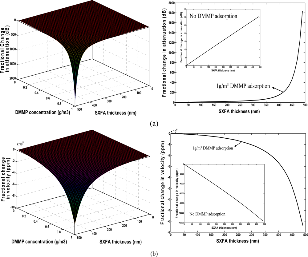 Using the extracted shear modulus and by means of Equations (1–5), the effect of the polymer thickness on gas sensing was simulated as shown in Figure 3. The real part of the bulk modulus is assumed to be constant at 10 GPa. Moreover, the influence of the imaginary part of the bulk modulus can be neglected [12]. Also, the modulus is assumed to have no relevance to the operation frequency. A 300 nm gold thin film was assumed to coat onto the substrate surface prior to polymer deposition. The perturbed SAW velocity and SAW-film coupling parameters by gold film can be deduced using the related formula mentioned in reference [15]. The DMMP with density of 1.145 g/cm3 and molecular weight of 124 was assumed as the target species for the chemical sensor. The concentration of DMMP is set to 0∼1,000 mg/m3 in the simulation. The partition coefficient logκ of SXFA towards to DMMP is 6.4 [22,23].The operation frequency of the chemical sensor is assumed as 300 MHz. In Figure 3, the resonation phenomenon in velocity and loss change exhibits the viscoelastic nature of the SXFA. For a given vapor concentration range, the velocity shift is approximately a linear function of the SXFA thickness when the thickness is less than 300 nm. When thicker polymers are applied onto the SAW sensor, a resonance peak is observed as the film thickness increases. The plasticization and viscoelastic nature caused the polymer to behave like an acoustically thicker one. The strongest sensor response appears at very thick SXFA thickness, over 450 nm, however, a trade-off should be considered due to the fact this is to accompanied by much larger attenuation in Figure 3(a) during the DMMP adsorption. To keep stable oscillation in gas sensing, the induced attenuation from the polymer deposition should be reduced as much as possible, hence a thin SXFA film of less than 100 nm was advised in our work, which leads to linearly velocity change with large amplitude and lower attenuation (less than 10 dB) in the vapor adsorption.