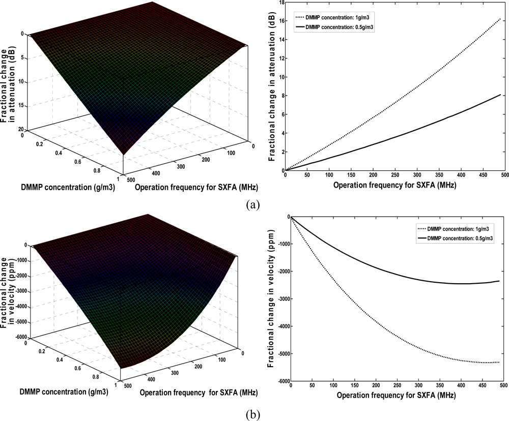 Figure 4 illustrates the relationships among the DMMP concentration (0∼1,000 mg/m3), operation frequency of polymer-coated sensor, velocity shift, and loss change under given SXFA thickness of 40 nm. The sensor response is approximately proportional to the given operation frequency in the assumed DMMP concentration range. The higher the operation frequency of the chemical sensor employed, the larger a sensor response will be achieved. However, similar to the polymer thickness effect analysis as above, higher attenuation was induced in the vapor adsorption when a higher frequency was applied. As shown in Figure 4, the largest sensor response towards to 1,000 mg/m3 DMMP was observed at max frequency of ∼500 MHz accompanying attenuation over 16 dB. Additionally, the advantageous sensor response-frequency dependence is hard to apply because of the decreased SAW device dimensions and thereby the area of the chemical interface with the operation frequency. Thus, the frequency of our SXFA-coated SAW sensor was set to 300 MHz, here, and good sensor response and a lower induced attenuation of less than 10 dB were observed.