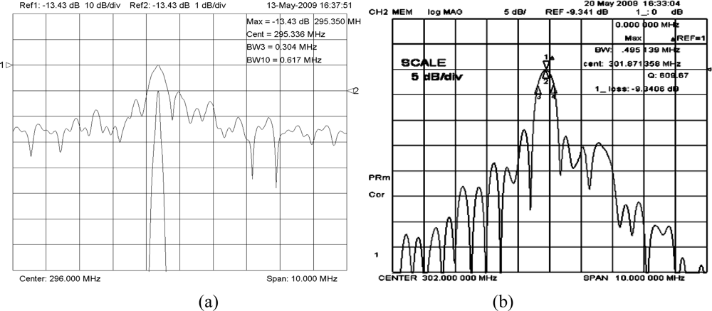 To make further improvement of the frequency stability, a new SAW delay line with Al/Au electrode structure was designed to decrease the insertion loss in this paper. As is well-known, the key parameter for the SPUDT design is the reflection coefficient of the electrode. Using the variational method and Campbell theory, the reflection coefficient of the Al/Au electrode was calculated depending on the fractional electrode thickness [24], also, the computation indicates the electromechanical constants was improved over the Cr/Au metallization, which was of benefit for the insertion loss reduction. On the basis of calculated results, a new 300 MHz delay line with SPUDT and combed transducer structure was designed and fabricated using the design parameters same as above devices in Figure 5(a) and Al/Au (30/200 nm) metallization. The S12 of the fabricated new device was tested by the network analyzer. As shown in Figure 5(b), a lower insertion loss of 9.3 dB was observed, obviously less than that of the delay line with Cr/Au metallization.