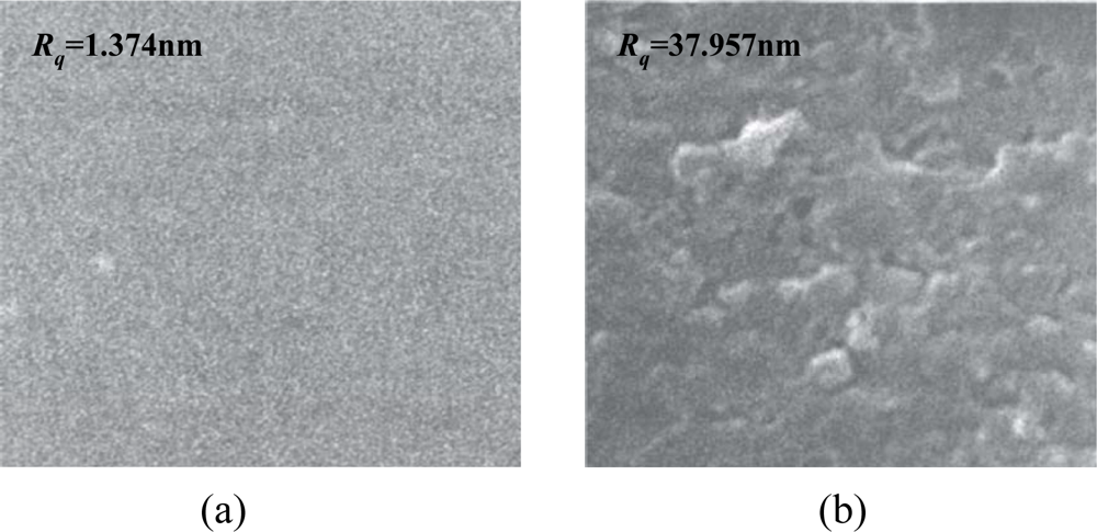In our study, the solvent-evaporating method was used for the SXFA deposition, due to its simple operation and low cost. The effectiveness of the solvent evaporating method to produce a stable polymer coating depends on the selection of the solvent type. Here, toluene was used as the solvent. Before the deposition of the SXFA film, the gold surface between the transducers was cleaned of any contaminants by a routine cleaning procedure involving rinsing in piranha solution [V(H2SO4):V(H2O2) = 3:1], a DI water rinse and drying by N2. Then, a 0.1 μL solution of 0.8 g/L SXFA/toluene was deposited on the cleaned gold surface 10 consecutive times. From the theoretical analysis above, the SXFA thickness targeted was ∼40 nm. After SXFA coating, the coated surface was characterized by scanning electron microscope (SEM), as shown in Figure 7. The thickness of the SXFA coating was evaluated by the atomic force microscopy (AFM) which approximately represented the surface roughness. Before SXFA coating, the gold surface roughness is only 1.374 nm [Figure 7(a)], less more than the coated surface, in which, the surface roughness is evaluated as 37.957 nm [Figure 7(b)], similar to the predicted values. Also, the solvent-evaporating induces porous and amorphous SXFA deposition, which benefits stereospecific adsorption. Also, to verify the theoretical analysis of the polymer thickness effect, SXFA layers with different thickness (10∼100 nm) was coated onto the fabricated SAW devices.