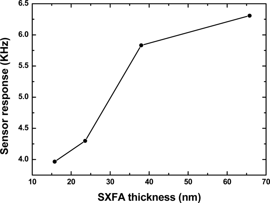 Then, SXFA layers with different thicknesses were deposited onto the quartz surface of the fabricated SAW delay line by solvent-evaporating as described below. Here, the SXFA was synthesized by reaction of polyallylmethylsiloxane and hexafluoroacetone (HFA). Also, the thickness was estimated approximately by atomic force microscopy (AFM). Meanwhile, using the Equation (5) and the measured frequency shift and loss change arising from the acoustically thin SXFA coatings monitored by the network analyzer, the shear modulus of the SXFA can be deduced as shown in Table. 1. Here, the bulk modulus in soft, elastic solids is typically much larger than the shear modulus, thus, the perturbation to SAW by polymer can be expressed by the shear modulus G: