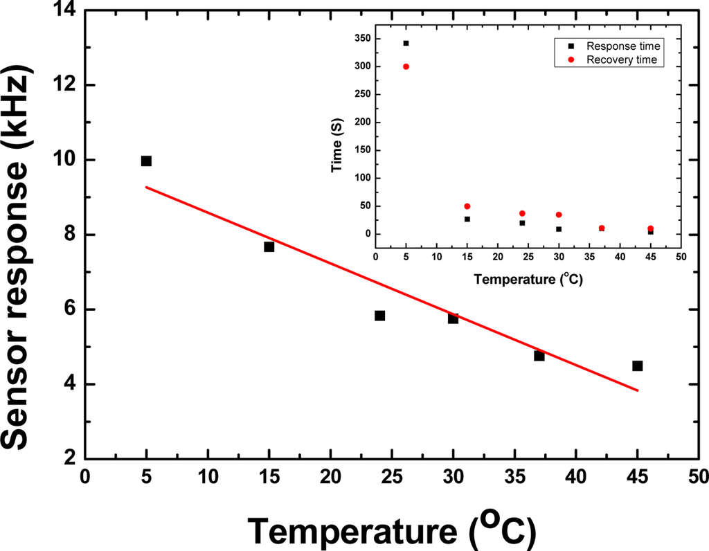 It is well-known that the viscoelastic nature of the polymer depends on the testing temperature. When a higher testing temperature was applied, stronger viscoelastic properties and weaker hydrogen bonds were exhibited, resulting in deviation of sensitivity, response and recovery time and frequency response. Actually, the temperature properties of the polymer were determined by the glass transition temperature (Tg). Using the differential scanning calorimetry (DSC) technique the Tg of the SXFA was measured as ∼−44 °C, far less than room temperature. A DMMP adsorption experiment was performed for SXFA-coated sensor under different temperatures. Figure 9 shows the sensor response value of the SXFA sensor to 200 mg/m3 DMMP at different temperatures and RH of 50%.