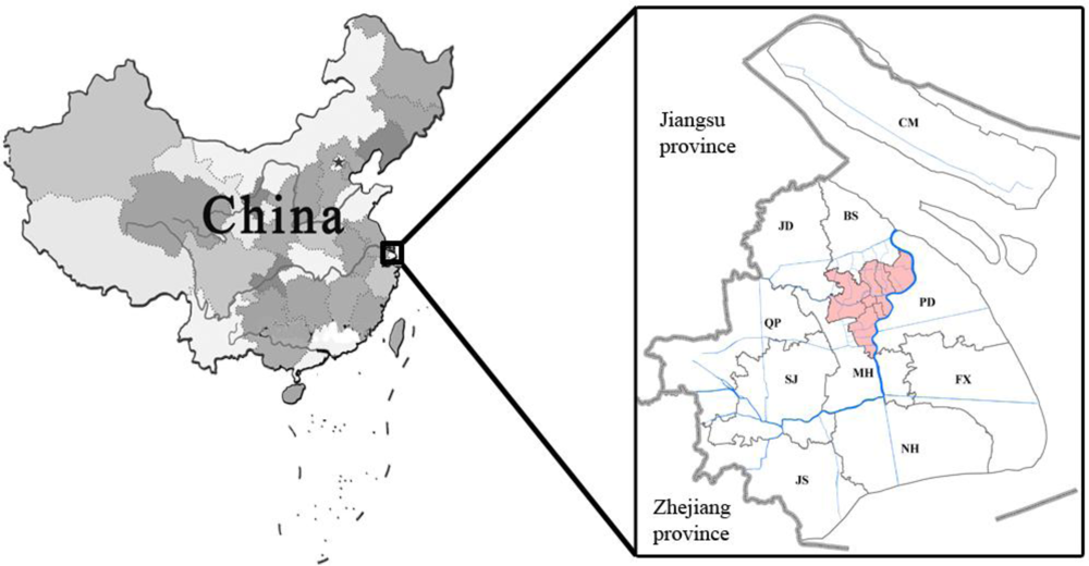 The present administrative boundaries of the Shanghai Metropolis consist of the city proper (including Hupu district/HP, Luwan district/LW, Changning district/CN, Xuhui district/XH, Putuo district/PT, Zhabei district/ZB, Jing’an district/JA, Hongkou district/HK, and Yangpu district/YP), suburban districts (including Minghang/MH, Pudong new area/PD, Jiading/JD, Baoshan/BS, Songjiang/SJ, Qingpu/QP, Nanhui/NH, Fengxian/FX, and Jingshan/JS), and Chongming county (CM). Therefore, the Shanghai Metropolis covers an area of 6,450 km2, with a total of 18.18 million residents []. Although this area accounts for only 0.05% of China’s territory, it plays a very important role in this country’s economy. In 2008, this area contributed 4.6% to this country’s total GDP. Local GDP per capita was 72,553 RMB Yuan (equivalent 10592 US dollars, current exchange rate is 6.85), approximately 3.2-fold of that nationwide average [].