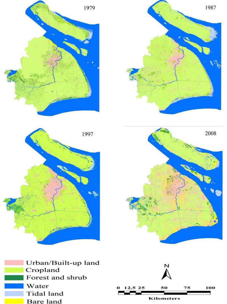 Figure 2, Tables 5, 6, 7, and 8 show significant land use conversion among different land use types occurred in 1979–2008. Herein, in order to well describe tempo-spatial pattern of LULC in the study area, in combination with socio-economic characteristics in different period of Shanghai, the span over the study period was divided into three stages: