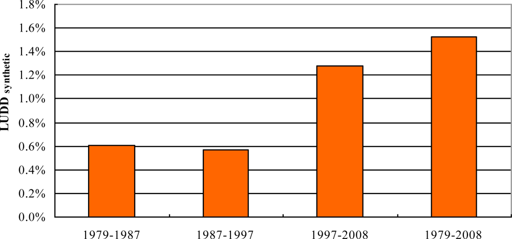Table 9 shows that area changes in land classes varied remarkably during each study period. Cropland, forest and shrub, water, and tidal land decreased at a low speed, whereas urban/built-up land and bare land increased at a relatively high speed. For the urban/built-up area, the change trend accelerated continuously during almost all periods, reaching the highest rate of 8.67% between 1997 and 2008 and an average dynamic rate of 7.25% between 1979 and 2008. Similarly, for the bare land, the change trend accelerated continuously except the period 1987–1997, reaching the average dynamic rate of 56.93% between 1979 and 2008. Moreover, Figure 3 shows a continuous increase trend of the land use change rate, ranging between 0.57–1.28%, with an average of 1.53% during 1979 and 2008. The rate of change of the land use in the study area has accelerated between the different time periods. Therefore, as shown in Figure 2, Tables 5, 6, 7, and 8, urban encroachment into natural and semi-natural ecosystems was detected. The result showed that approximately 83.83% of the newly urban/built-up area was converted from forest and shrub, cropland, water, and tidal land. Another significant change was the continuous incline in bare land, which was mainly caused by mining pits, stock dumps, enclosed tidal land, and abandoned croplands enclosed for development under the pressure of rapid urbanization.