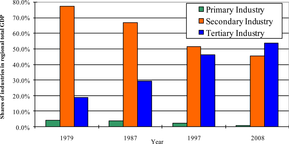 Shanghai has recently experienced an impacting period of industrial transformation during its way toward prosperous development [,]. Figure 4 shows that the shares of agriculture/primary industry (mainly farming, forestry, fishery, husbandry and ranching), secondary industry (mainly mining, refining, manufacturing, energy and water supply, construction) and tertiary industry (mainly service and trade) in total GDP were 3.98%, 77.23%, and 18.79%, respectively, in 1979; however, they were 0.82%, 45.52%, and 53.66%, respectively, in 2008.
