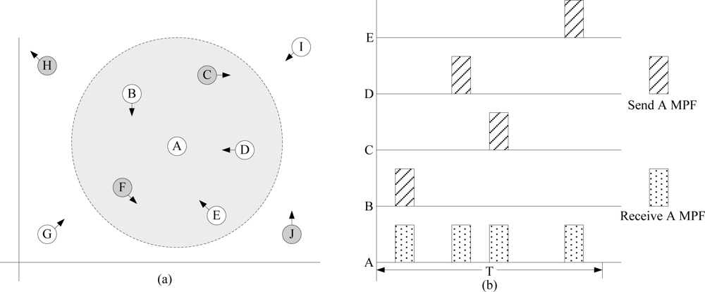 EQ-MAC employs a preambleless asynchronous scheme. Instead of a long preamble or a series of short preamble packets sent before the data packets, each node will wake up periodically and send MPF. The awake neighborhood nodes will complete the neighbor discovery process once the MPF packets are received. In EQ-MAC’s asynchronous duty cycle, each node broadcasts an MPF containing its own ID on schedule to notify all its neighbors of its identity. Upon receiving the MPF, awake neighbor nodes will update their neighbor tables immediately. As Figure 1(a) shows, nodes move in random directions, as denoted by the arrows. The rotundity field is the communication area of Node A; Nodes B, C, D, E and F can contact Node A, but Nodes G, H, I and J cannot. The dark nodes, i.e., Nodes C, F, H, and J, are asleep during the fixed listening period of T. In Figure 1(b), once Node A wakes up, it starts listening to the channel. During the listening period, nodes in the communication range of Node A and that are awake broadcast MPFs. Nodes will detect the channel before sending MPF, and if there is communication in the channel, the nodes will back off for a random time. Otherwise, MPF will be sent immediately. Node A receives MPFs from its neighbor Nodes B, C, D, and E. Note that while Node C is asleep at the beginning of T, it wakes up later and broadcasts an MPF on schedule. Node F stays asleep during T, so Node A does not receive any information from it. When the listening period is over, Node A immediately updates its neighbor table according to the received MPFs.