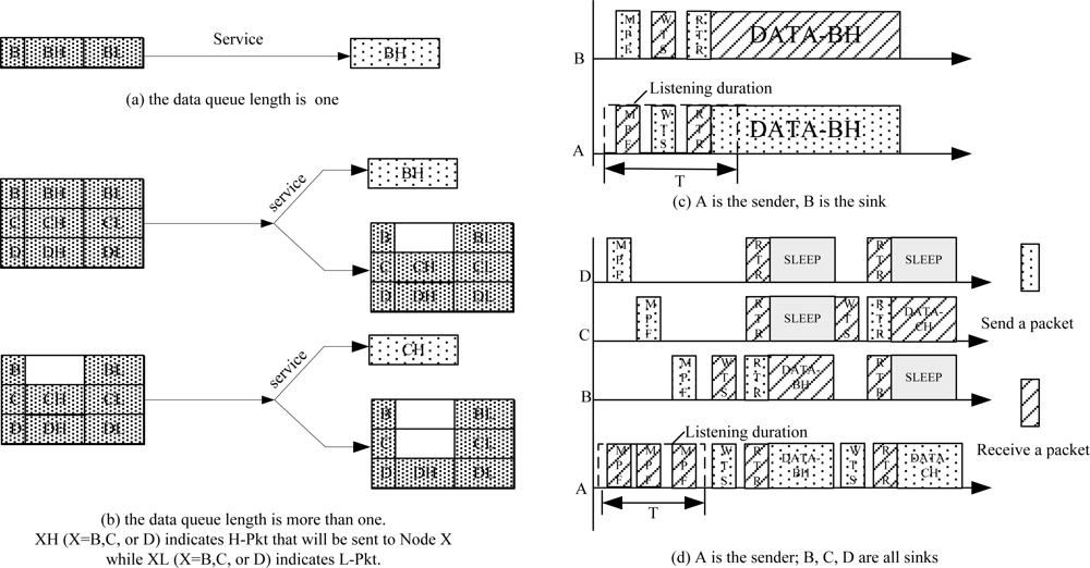 In Figure 3(a), there is only one group of packets in the data queue which would be sent to Node B, and undoubtedly they can be served once the sensor node meets the target sink (Node B) and receives its MPF. The sender will first send H-Pkts (BH as shown in Figure 3(a)) for their higher priority. Figure 3(c) shows the data transmission process between Node A and B. The listening duration will end in advance when Node A meets Node B and detects Node B as the target. Then data transmission starts. When the data queue length is more than one, as shown in Figure 3(b), more than one group of data messages exist in the data queue. The data messages are grouped together according to the ID of their target nodes. Each panel stands for one group of data messages and sorts the H-Pkts and L-Pkts that will be sent to the same sink node according to their own priority. The creation of the data queue and data packets sorting process can be handled efficiently, so the extra cost of the queue management in our MAC protocol implementation is negligible. Once the sensor meets the right receiver it prefers to send the H-Pkts.
