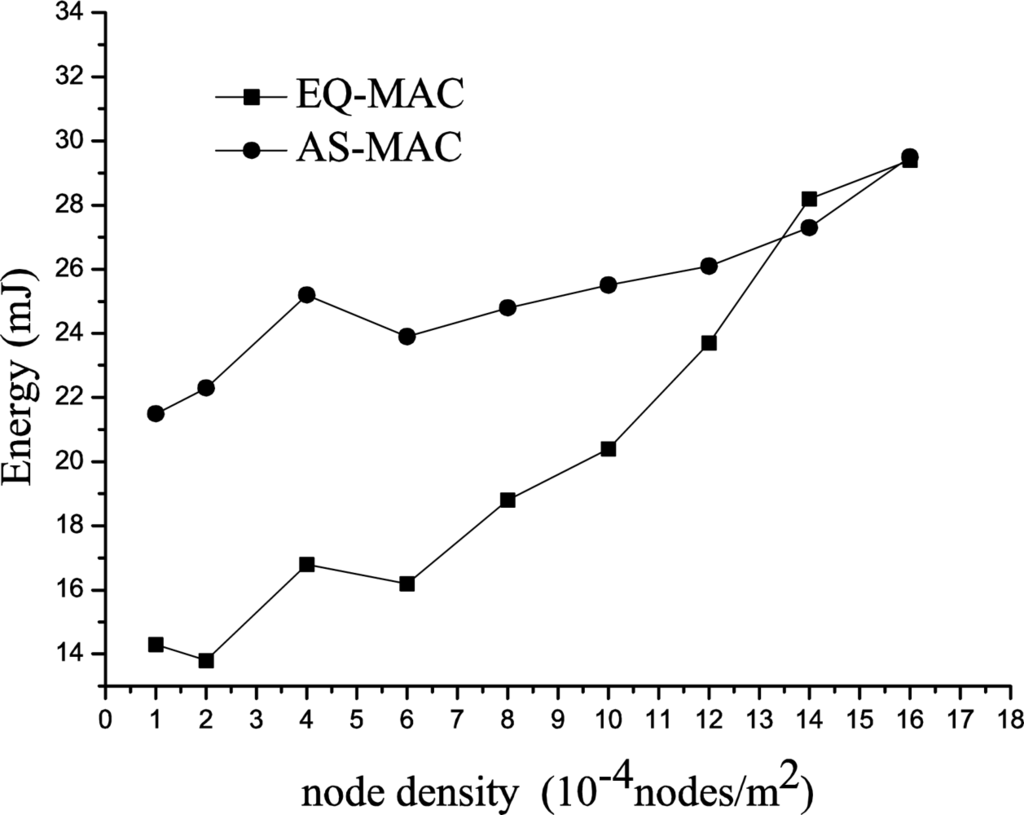 In a delay-tolerant and mobile network environment with a highly dynamic and sparse network topology, the average energy consumption in EQ-MAC visibly decreases compared with other MAC protocols in which the sender always initiates data transfers first. As Figure 5 shows, when the nodal density is less than 10, EQ-MAC yields a more efficient power saving in comparison with AS-MAC. The reason for this difference is their different data transmission mechanisms. In conventional MAC protocols like AS-MAC, data transfers are initiated by the sender. In a mobile and sparse network environment, this can easily lead to a transmission failure because the target node may be not in the contact area of the sender, and the consequently useless retransmission would increase energy consumption. But in EQ-MAC, it is the intended sink that initiates efficient data transfers through the neighbor updating process. This scheme assures successful data transmission, reduces the probability of data retransmission, and decreases transmissions of control packets; the result is higher energy efficiency.