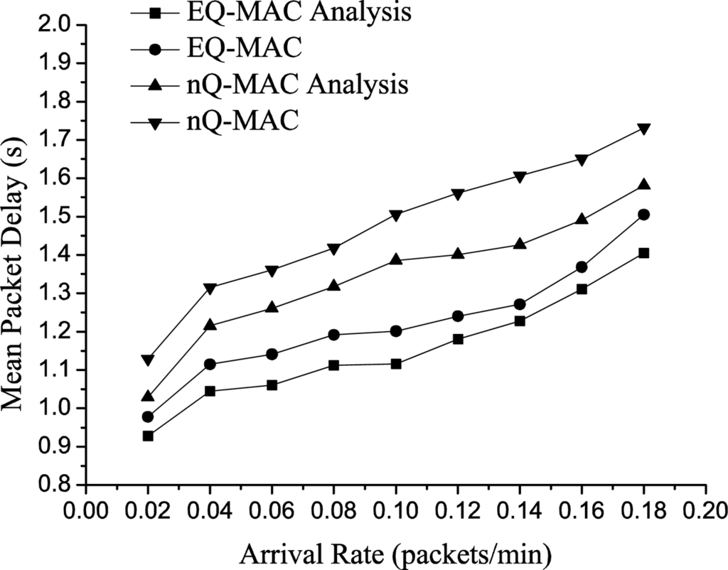 Figure 6 plots the mean packet delay. The mean packet delay for EQ-MAC is 25% less than that of the conventional MAC protocol. Such a significant difference in favor of EQ-MAC is attributed to the dynamic queue-management scheme based on priority. In the conventional protocol, packets are transmitted according to their arrival sequence. On the other hand, the transmission sequence in EQ-MAC is based on the priority of packets, and we can dynamically manage the data queue. Thus, useful information can arrive in a more timely manner than in the non-queue-management strategy. Note that in the experiments, data packets were stored in memory and were sent or received by the hardware components of the ISC_Mote. There were thus delays in the communications between the hardware components. This means the analytical results always appear to be better than the experimental ones.