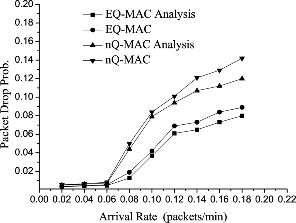 Figure 7 plots the packet drop probability for H-Pkts against the effective arrival rate. We can see that the packet drop probability for H-Pkts in EQ-MAC becomes lower than that of the non-queue-management strategy as the arrival rate increases.
