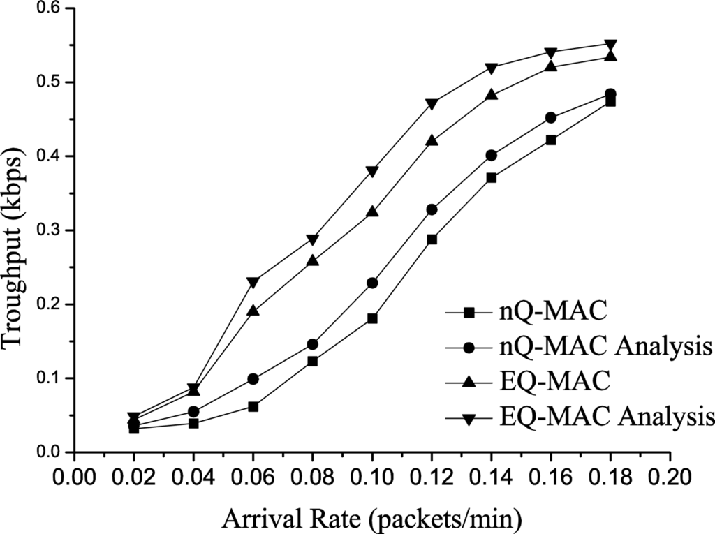 Furthermore, the dynamic queue-management strategy increases the efficiency of H-Pkt transmission. When the node density is 10, the system throughput increases by 88.9% in comparison with the non-queue-management MAC protocol. When the arrival rate is 0.10, EQ-MAC has 79% increase in throughput compared with the non-queue-management MAC protocol. The results of the experiments and the theoretical analysis were somewhat different because the sending and receiving processes of the hardware were different from those of the theoretical analysis. For example, when data packets appear with high frequency, the wireless hardware module for sending and receiving data would have not enough time to deal with them or sufficient memory to accept and store some of them. Hence, some of these packets were discarded and could not be received in the experiment.