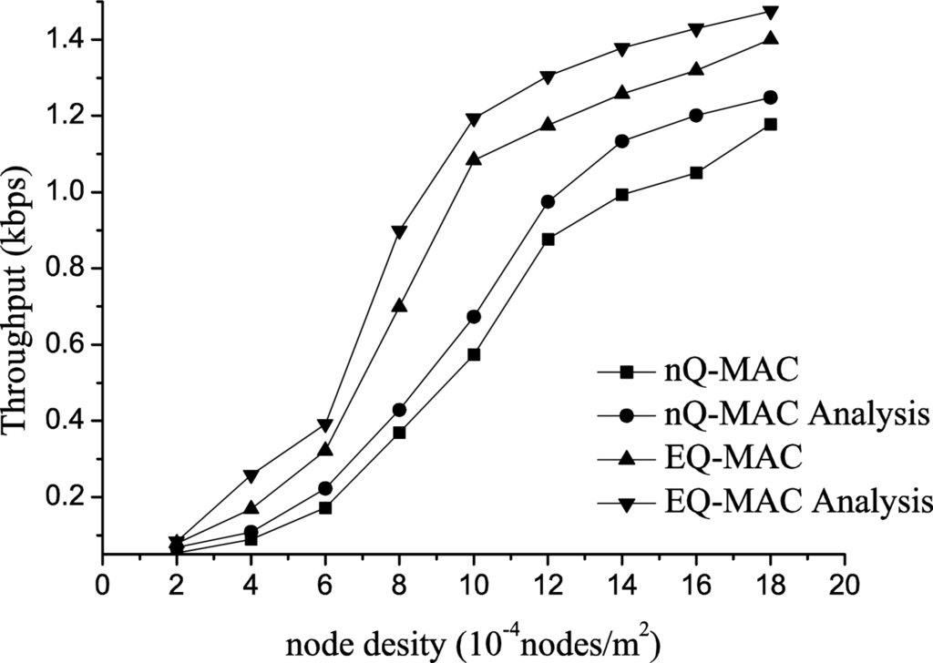 Figures 8 and 9 show the throughput for H-Pkts. When the network topology is sparse, EQ-MAC has better throughput because the process of data transfers initiated by the target sink ensures successful data transfers.