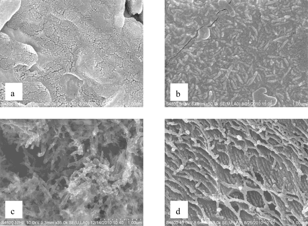 SEM images show that the morphology of TiO2/PANi changes depended on the ANi concentration. Without ANi, TiO2 nanoparticles in the form of uniform granular with mean sizes around 20–25 nm are created (Figure 1a). When ANi is added, the resulting nanocomposite appears in the form of long PANi chains. The length of the chain increased with increasing ANi concentration (see Figures 1b, 1c, and 1d). The TiO2 nanoparticle size is significantly reduced in the presence of PANi.