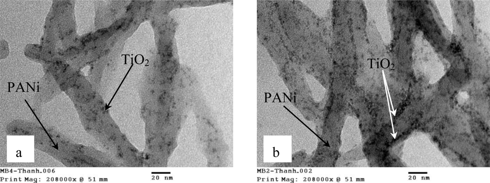 As can be seen from the TEM images in Figure 2, black TiO2 nanoparticles with sizes around 3–4 nm are randomly distributed in the PANi matrix and tend to line up along the PANi chains. Consecutive p-n junctions of TiO2 nanoparticles and PANi are formed, as a result a variety of shallow levels (both donor and acceptor) are created in the nanocomposite.