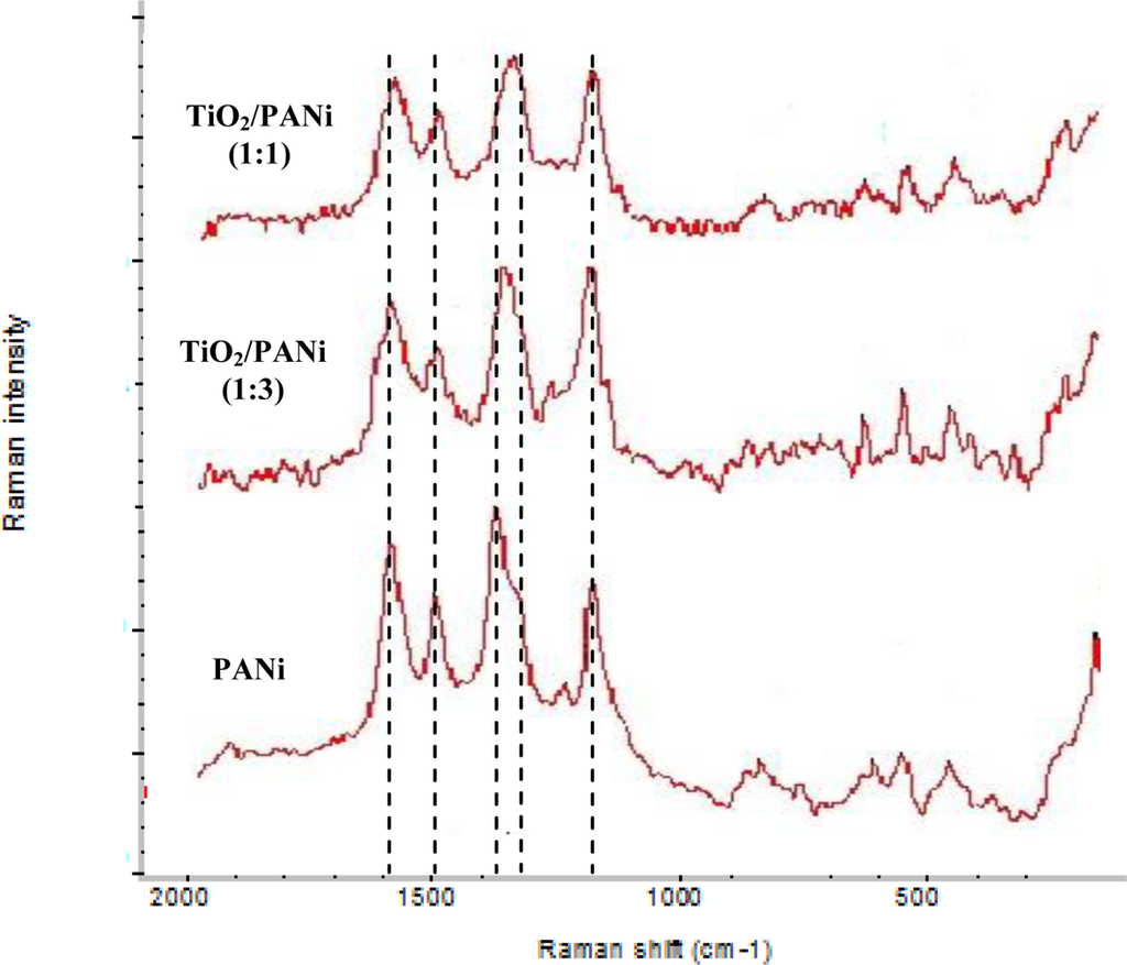 Raman spectra recorded for the TiO2/PANi nanocomposites (see Figure 3) show the vibration modes characterizing of PANi emeradine and anatase TiO2. In the Raman spectrum of the anatase single crystal TiO2 the following modes can be assigned: ∼144 (Eg), 197 (Eg), 399 (B1g), 513 (A1g), 519 (B1g) and 639 cm−1 (Eg). From the Raman assignment of the PANi vibration modes in Table 1, the band in the 1,490 cm−1 region is due to the C-N stretching vibration from benzenoid (B) ring while the band near 1,580 cm−1 is related to the C=N stretching from quinoid (Q) structure, the 1,140 cm−1 band is assigned to a vibration mode of the B-NH+=Q structure. It is an electronic-like band and is considered as a measure of the degree of delocalization of electrons. The three bands at 1,580, 1,490 and 1,140 cm−1 are slightly red shifted in TiO2/PANi nanocomposites indicating a slight effect of TiO2 on the bonds involved in these bands. The most striking point observed in Raman spectra is the red shift and increase in the intensity of the 1,338 cm−1, band which is assigned to the C-N+ stretching mode (semiquinoid form) of PANi in the nanocomposite. The 1,338 cm−1 band involves the polaron lattice and thus relates to the pristine conductance of the PANi.