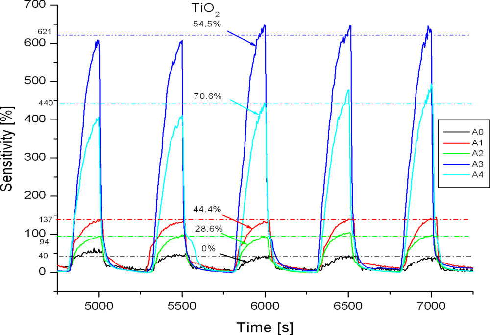 The sensing behavior of TiO2/PANi nanocomposite upon exposure to NH3, a reducing agent acting as an electron donor, is different. The NH3 sensing profile of TiO2/PANi nanocomposite is shown in Figure 6. As can be seen from the figure, the resistance of TiO2/PANi layer increases as NH3 gas is injected. Upon interaction with NH3 some electrons are added into the valence band of the PANi p-type semiconductor, and as a result the conductance of PANi is decreased. The NH3 sensitivity of TiO2/PANi is high, but gradually declines with increasing cycles due to the saturation of NH3 adsorbed on the PANi surface. The nanocomposite with TiO2 concentration around 45.0 at % shows a peak in NH3 sensitivity. The effect of the n-type semiconducting TiO2 nanoparticles on the overall conducting properties of the nanocomposite is considered to be a reason, however the mechanism and the nature of the effect are still unclear.