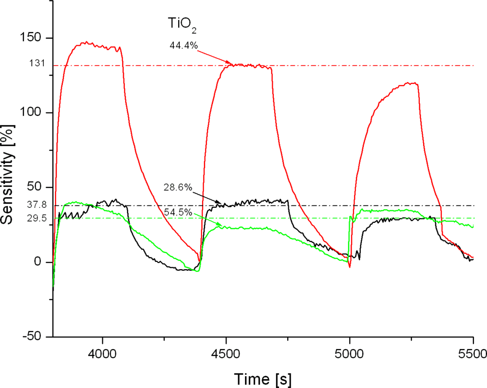 The conductivity of TiO2/PANi layers is found to be strongly affected by the environment. As can be seen from Figure 5 the resistance of TiO2/PANi layers changed with dry air pressure which was controlled by a vacuum pump. The reduction of air pressure causes a fast increase in the resistance of the TiO2/PANi layers and vice versa. The change in conductivity is accounted for by the interaction between oxygen (an electron acceptor) and PANi which loses more electrons in valence band then converts to be a p-type semiconducting species. The response and the recovery are fast, indicating the fact that the physical adsorption is dominant in the process. As can be seen from the plots, the sensitivity is strongly depending on TiO2/PANi ratio. Pure PANi exhibits a sensitivity of around 30–40%, while TiO2 shows no sensitivity. The highest sensitivity of around 650% is found in the composite containing around 55.0% of TiO2. In comparison to pure PANi, a 20–25 folds improvement in sensitivity is achieved. The appearance of a variety of n-p semiconductor contacts likely facilitates the formation of various gas molecular adsorption sites on the PANi surface (shallow levels). Oxygen, an electron acceptor, compensates for the sites gaining electrons on the PANi chain and this enhances the oxygen adsorption on the PANi surface.
