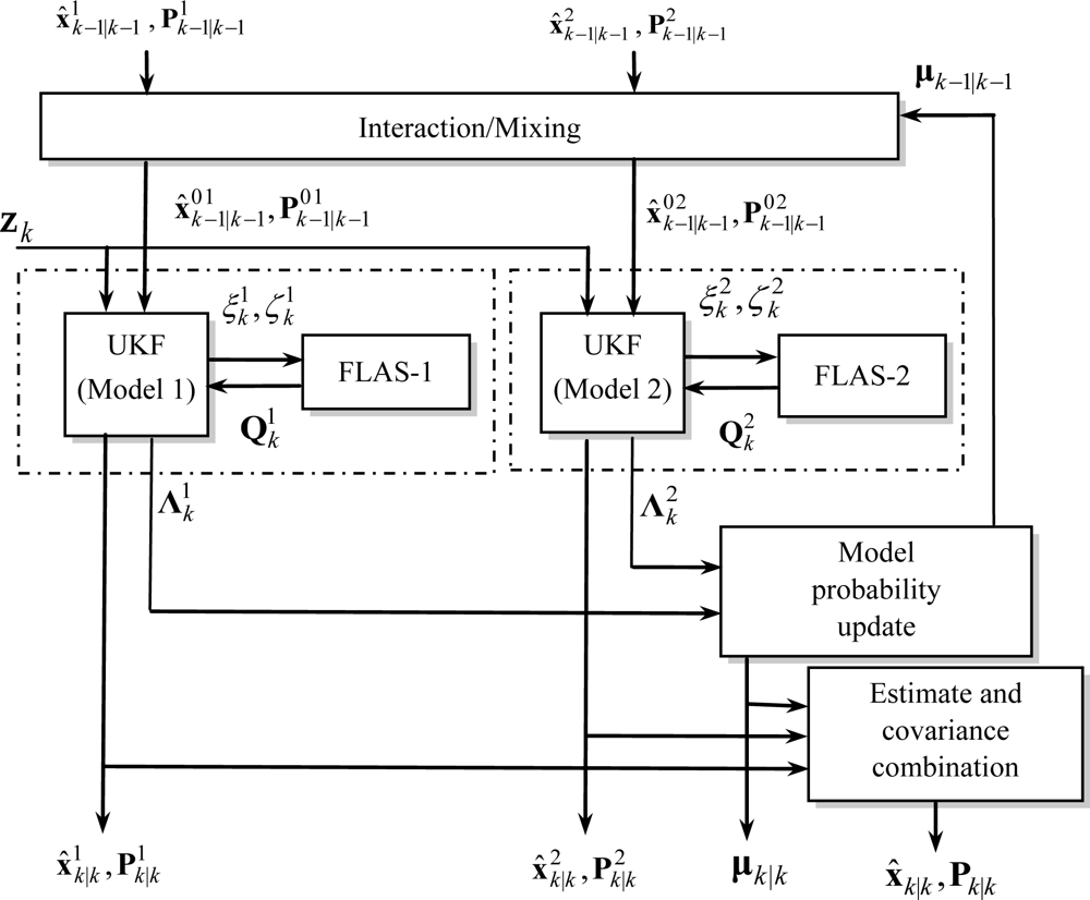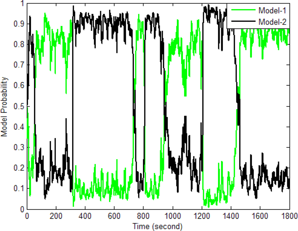 The IMM approach takes into account a set of models to represent the system behaviour patterns or system model. The estimator carries out a ‘soft switching’ among various models by the model probability. The overall estimates is obtained by a combination of the estimates from the filters running in parallel based on the individual models that match the system modes. The measurements could be obtained from one or more sensors, and the model-matched filters could be linear or nonlinear. The algorithm of IMM-nonlinear filters is introduced to deal with the noise uncertainty and system nonlinearity simultaneously.