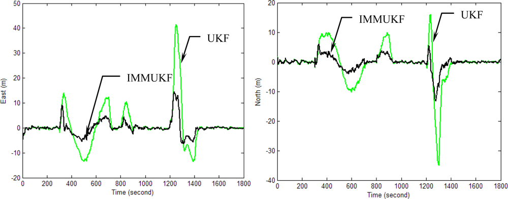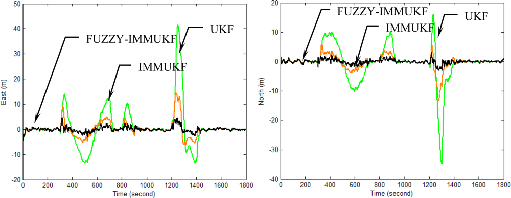 The synergy of Global Positioning System (GPS) and inertial navigation system (INS) has been widely explored due to their complementary operational characteristics [1,26]. The GPS/INS integrated navigation system, typically carried out through the EKF and UKF, is the adequate solution to provide a navigation system that has the superior performance in comparison with either the GPS or INS stand-alone system. The example on the tightly-coupled GPS/INS integrated navigation processing based on the FUZZY-IMMUKF will be presented. The performance comparison will be demonstrated by using the proposed FUZZY-IMMUKF method as compared to the relatively conventional UKF and IMMUKF approaches.