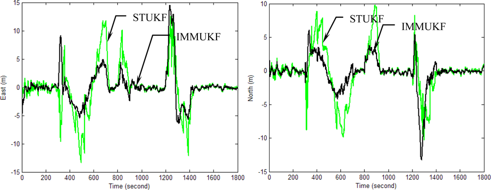 The IMM algorithm has been originally applied to target tracking [14–17], and recently extended to Global Positioning System (GPS) navigation [18,19], and integrated navigation designs [20–23]. A model probability evaluator calculates the current probability of the vehicle being in each of the possible modes. A global estimate of the vehicle’s state is computed using the latest mode probabilities. This algorithm carries out a soft-switching between the various modes by adjusting the probabilities of each mode, which are used as weightings in the combined global state estimate. The covariance matrix associated with this combined estimate takes into account the covariances of the mode-conditioned estimates as well as the differences between these estimates.