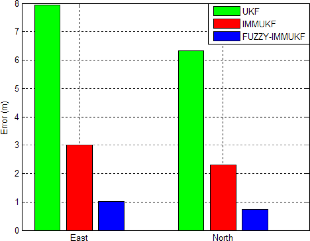The fuzzy system is employed for dynamically adjusting the lower and upper bounds of the process noise covariance, which will be used in each of the parallel filters in the IMM architecture by monitoring the innovation information so as to provide further improvement in estimation accuracy. Through the proposed approach, lower order of filter model can be utilized and, therefore, less computational effort will be sufficient without compromising estimation accuracy significantly. When a designer does not have sufficient information to develop the complete filter models or when the filter parameters are slowly changing with time, the fuzzy system can be employed to enhance the IMMUKF performance. These performance comparisons of UKF, IMMUKF and FUZZY-IMMUKF have been conducted and the proposed FUZZY-IMMUKF algorithm has demonstrated very promising results in navigational accuracy. Future research can be conducted to undertake the implementation of the following issues.