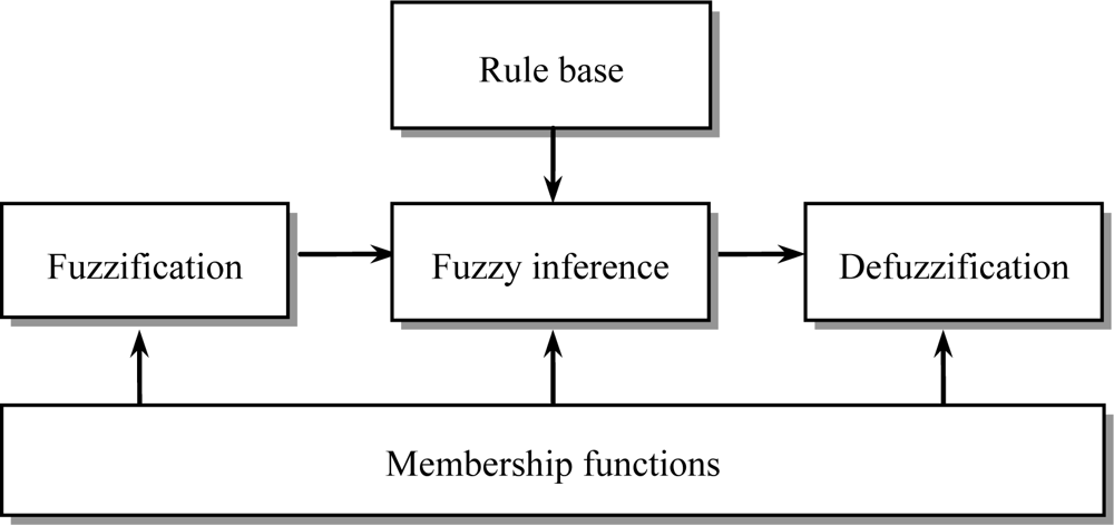 Fuzzy logic was first developed by Zadeh in the mid-1960s for representing uncertain and imprecise knowledge. It provides an approximate but effective means of describing the behavior of systems that are too complex, ill-defined, or not easily analyzed mathematically. A typical fuzzy system consists of three components, that is, fuzzification, fuzzy reasoning (fuzzy inference), and fuzzy defuzzification, as shown in Figure 2. The fuzzification process converts a crisp input value to a fuzzy value, the fuzzy inference is responsible for drawing calculations from the knowledge base, and the fuzzy defuzzification process converts the fuzzy actions into a crisp action.