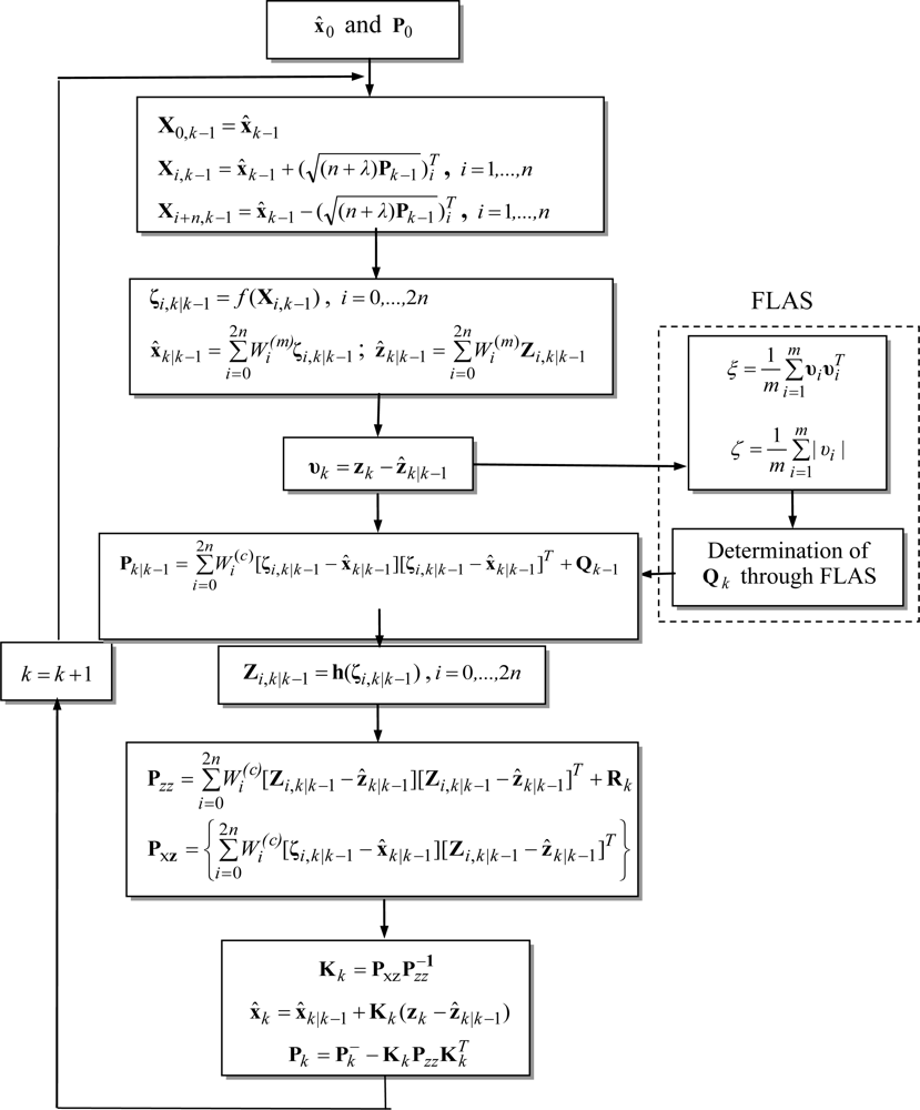 In the FLAS, the DOD parameters are employed as the inputs for the fuzzy inference engines. By monitoring the DOD parameters, the FLAS is able to on-line determine better lower and upper bounds of the process noise covariance according to the innovation information, and therefore improves the estimation performance. The flow chart of the FLAS-UKF algorithm is shown in Figure 3.